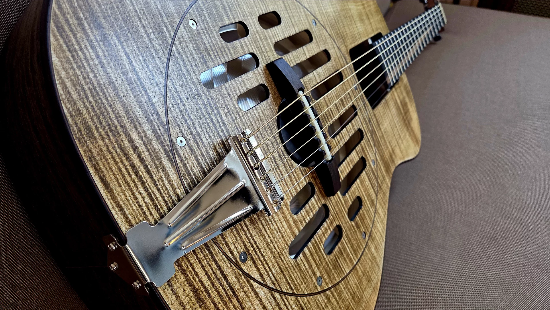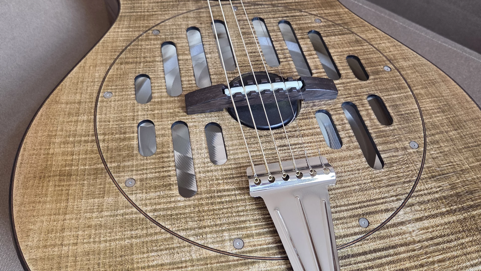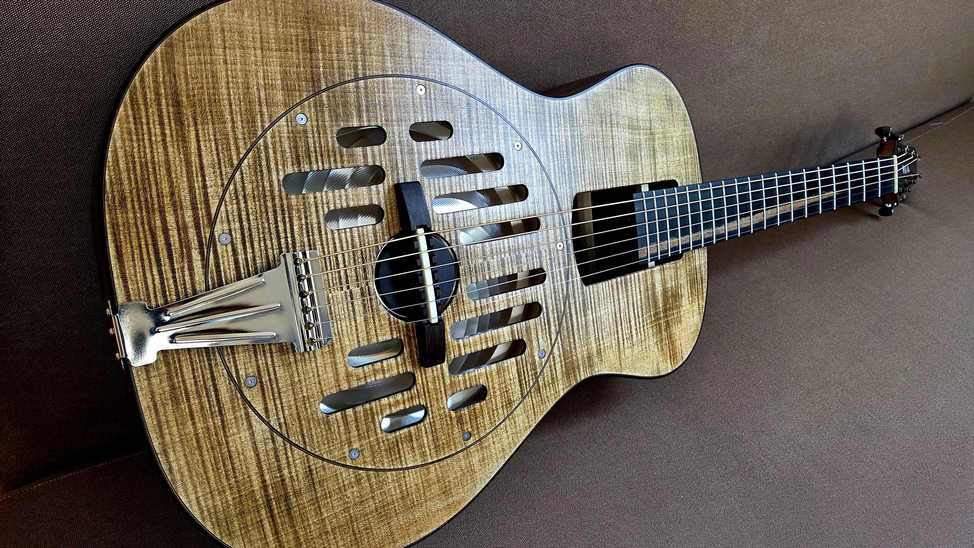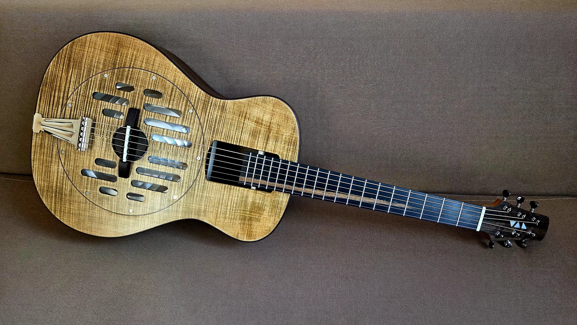 Woodbody Singlecone Resonatorgitarre. Korpus aus Mutenje, Decke Riegelesche, Hals Kirsche. Binding Palisander mit Zierspänen zu Zargen, Boden und Decke. Halsübergang am 13. Bund, Sattelbreite 46,5mm Mensur 635mm. Sideclose-Griffbrett mit Edelstahlbünden. Sattel und Stegeinlage Knochen. Griffbrett aus Ebenholz. Headless-Mechaniken von Michael Michael Sankey, Kanada. Resonator & Bisquit von National NRP. Tonabnehmer: Highlander iP-1X/ Besonderheiten: Viele! :-)