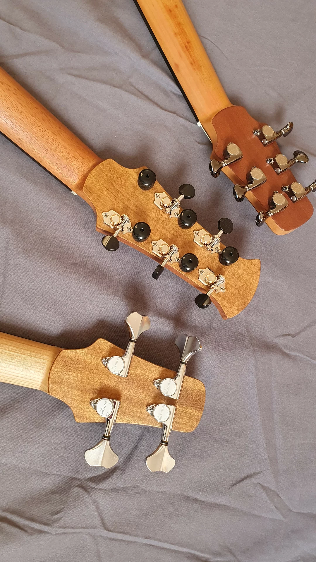 Modell A -“Strandgut”/ Korpus aus Ovangkol, Decke False Cypress, Hals Kirsche/ Korpusform OM-Größe/ Halsübergang 14. Bund, Sattelbreite 46mm/ Mensur 648mm/ Sideclose-Griffbrett & Edelstahlbünde/ Ränder Palisander mit blauen Zierspänen zu Zargen, Boden und Decke/ Sattel und Stegeinlage Knochen/ Mechaniken Gotoh (18:1) mit Griffen aus Ebenholz/ Stegpins aus Ebenholz/ Steg und Griffbrett aus Ebenholz/ Besonderheit: Manzer-Wedge/ Preis: 3400.- Euro