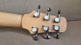 Irish Bouzouki. Inspiriert durch das Schaffen meines Freundes Heiner Dreizehnter baue ich Irish Bouzoukis bzw. Cistern in Gitarrenform. Die aktuellen Saiten sind für F-Stimmungen FCFCF oder FHFCF gewählt. Mit entsprechend stärkeren Saiten lassen sich alle anderen gängigen Bouzouki-Stimmungen bewerkstelligen. Korpus aus Tasmanian Blackwood, Decke Alpenfichte, Hals aus Mahagoni / Korpusform OM-Größe mit Manzer-Wedge/ Halsübergang am 14.Bund. Sattelbreite 46mm/ Mensur 648mm / Sideclose-Griffbrett & Edelstahl-Bünde/ Ränder aus geräuchertem Mahagoni mit Zierstreifen zu Decke und Boden. Sattel und Stegeinlage aus Knochen. Mechaniken: Steinberger Gearless und Schaller Grand Tune. Preis: 5000.- Euro (Grundpreis 4500.- € plus Hiscox Koffer plus Rösner Hash Tonabnehmer)